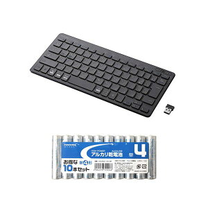 mの薄型設計! 安定した通信で快適に操作できる2.4GHzの無線薄型ミニキーボード。☆この商品は 【ワイヤレスミニキーボード/パンタグラフ式/薄型/ブラック】 と 【アルカリ乾電池 単4形10本パック
