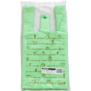 手描きの文字とゆるいイラストがかわいいレジ袋です。淡いグリーンは清潔感があり、さわやかな印象です。 厚み:0.016mm サイズ:W180×H350×D100mm 入数:100枚