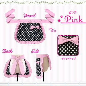 ドット柄にビビットなカラーでかわいさ満点♪ポップでキュートなドット柄のショートエプロンです。大きめリボンとポケットがかわいいアクセント♪たっぷりフリルと長めのウエストリボンでどこ