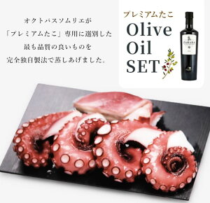 ギフトにもおすすめ! 【内容量】 プレミアムたこ1尾(約900g ?1.1kg)/オリーブオイル1本(250ml) 【産地】 モーリタニア(プレミアムたこ)/イタリア(オリーブオイル)
