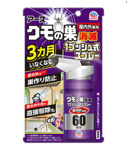 【商品名】 アース クモの巣消滅 1プッシュ式スプレー 屋内外兼用 【保管上の注意】 ・子供の手の届かない所に保管すること。 ・直射日光や火気を避け、涼しい場所に保管すること。 ・缶のさびを防ぐため、水回りや湿気の多い場所には置