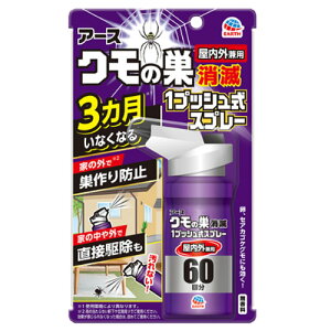 【商品名】 アース クモの巣消滅 1プッシュ式スプレー 屋内外兼用 【保管上の注意】 ・子供の手の届かない所に保管すること。 ・直射日光や火気を避け、涼しい場所に保管すること。 ・缶のさびを防ぐため、水回りや湿気の多い場所には置