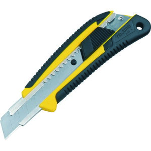 特長 ●強力ネジ式ロックです。 ●頑丈な0.8mm厚ブレードホルダーを採用しました。 ●プラスチックボディに軟質のエラストマ―を一体成型です(ダブルインジェクション製法)。 ●濡れた手や軍手でも滑りにくく、確かなパワーが得られます。