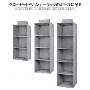 クローゼットやハンガーラックのポールに吊るすだけで簡単にタテ置き収納の棚が設置できます。棚置き式で、出し入れが簡単にでき、シャツやセーター、帽子などの気になる型くずれを防いで収納できます。ポールに巻き付けるだけで簡単