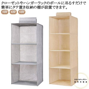 クローゼットやハンガーラックのポールに吊るすだけで簡単にタテ置き収納の棚が設置できます。 棚置き式で、出し入れが簡単にでき、シャツやセーター、帽子などの気になる型くずれを防いで収納できます。 ポールに巻き付けるだけで簡