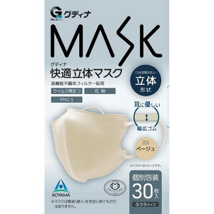 グディナ 快適3D立体マスク 個包装 ベージュ ふつうサイズ 30枚入。衛生的で持ち運びに便利な個別包装。耳に優しい幅広ゴム。