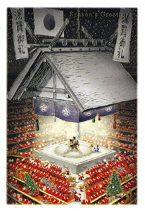 日本の伝統的な図柄を用いた海外にも好評の和風のクリスマスカードです。 浮世絵の相撲を題材にした扇子のカードです。 ミニチュアの扇子はとり外して飾って頂くこともできます。 和紙による扇の透かしが入った中紙と封筒が入っており