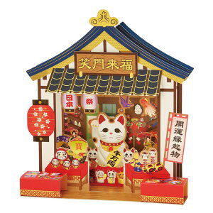 カードを起こすと、招き猫、だるま、宝船、打ち出の小づちなど、縁起物や和小物がぎっしり並んだお店が立体になります。 3層で表現されたお店の奥行きは、ミニチュアハウスをのぞくような楽しさがあります。 全面に金箔加工がほどこさ