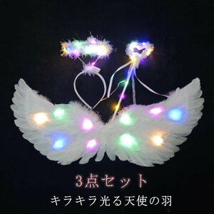 【3点セット】【キラキラ光る天使の羽】セット内容:羽+ステッキ+カチューシャキラキラ光る天使の羽セット。LEDできらきら光るから、舞台や夜のパーティーでも大注目する間違いなし。ボリュームで柔らかい羽、背負うだけで天使に変身...