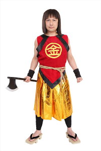 『金』の大きな刺繍がポイントの上着は高級感があり、黒で縁取りされた帯が全体をすっきり見せてくれます。 金色の袴風スカートもインパクトがあり目立ち度抜群です! ワイルドな腰ひもを結んでかっこいい金太郎に変身! 【セット内容