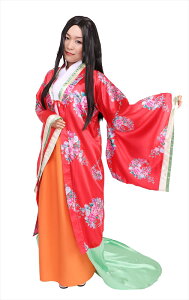 前合わせ付だから何枚も重ねて着ているように見えるのがポイントの着物。 赤に鮮やかな花柄はとても華やかにみえます。 着物のように見えるオレンジ色のスカートはウエストがゴムの仕様なので着脱も簡単です。 大奥やお姫様をイメージ