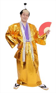とにかく派手で豪華に見える金色の羽織と袴。 目立つこと間違いなし!袖なし着物は右開きの紐仕様なので着脱も簡単。 金色の袴はウエストがゴム仕様なので楽チンです。 メイク次第で殿様、悪代官どちらにもなれますよ〜 【セット内容】