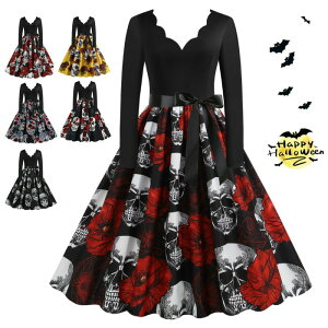 【美シルエットを叶えるAライン】 上半身はシンプルな黒無地ですっきりと、スカート部分はふんわりと広がるフィット&フレアデザイン。 ウエストを細く見せ、スタイルアップ効果抜群です。 【甘辛ミックスなスカル&フラワー柄】 ホラ
