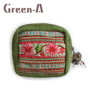 タイのモン族刺繍布をリメイクして作られたポーチ。グリーン・ブラウン・レッドの3カラー×3柄バリエーション。 細やかな手刺繍の古布と、ざっくり手織りコットンを合わせて。 内側には小さなポケットファスナーが1つ付いており、メイン