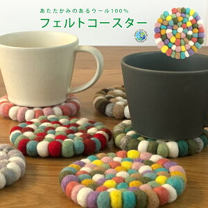 羊毛 フェルトコースターの紹介 温かみのあるカフェタイムに、羊毛フェルトボールのコースター。 カップはもちろん、急須や小さめのポットマットにもちょうど良いサイズです。 優れた保温性・吸湿性・難燃性・消臭性をもつ天然ウールを