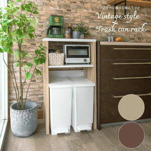ヴィンテージ木製ごみ箱上ラック すき間収納タイプ! 中途半端なすき間をピッタリ埋めてくれるスリムなゴミ箱上食器棚です。 一般的な30Lのゴミ箱を1台収納することができます。 上部は扉収納とオープン収納がある為、食器や家電などを