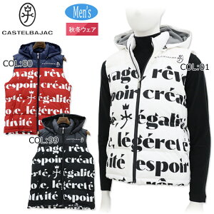 カステルバジャックのダウンベスト。 インパクト感のあるロゴデザインを 全体にあしらいモノトーンカラーで構築したダウンベスト。 ファブリックチェンジデザインとグラフィカルな ロゴデザインがポイントとなっています。 フード部分