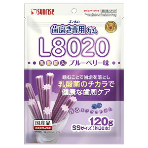 【商品説明】●小型犬にも噛みやすい弾力のあるセミハードタイプの歯磨きガムです。●噛むことで歯垢を落とし、L8020乳酸菌のチカラで健康な歯周の維持をサポートします。●お口がさわやかに香るブルーベリー味。●原材料:でん粉類、