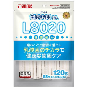 ・小型犬にも噛みやすい弾力のあるセミハードタイプの歯磨きガムです。・噛むことで歯垢を落とし、L8020乳酸菌のチカラで健康な歯周の維持をサポートします。 商品情報 原材料肉類(コラーゲン等)、食物繊維、発酵乳粉末(L8020乳酸菌)、増粘
