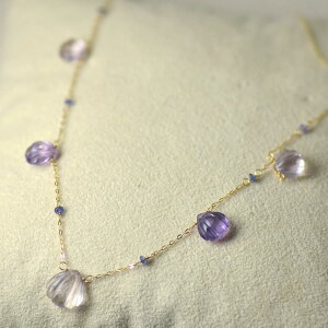 シェルの形のアメシストとライトアメシスト。 間にブルーのサファイアを配した 涼やかなフリンジネックレス。 上品な色合いで装いも年齢も選びません。 シェルの形ってかわいいですね。 ピアスとセットになるデザインです...
