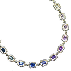 K18のチェーンの間に、透け感のあるピンクサファイアと カット面が煌めくピンクオパールを配したネックレス。 素材の質感の違いが変化にとんだ表情です。 大人のピンクですね。