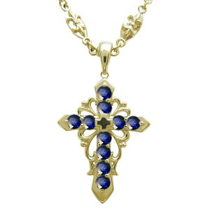 9月誕生石サファイアを使用した、18金製のクロス&アラベスク(唐草)デザインメンズ・ネックレスペンダントです。 オリジナルの百合の紋章モチーフチェーンを使用し、贅沢なネックレスに仕上げました。 ※【1...