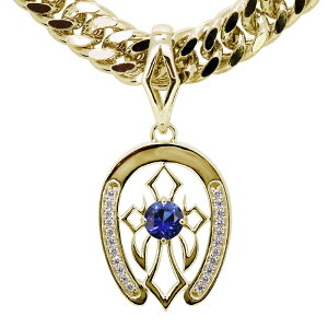 9月誕生石サファイアを使用した18金製の、馬蹄(ホースシュー)&十字架(クロス)モチーフの、メンズネックレス(ペンダント)です。 クロスの透かしデザインに天然石が煌めき、大人の男性の胸元をおしゃれに飾ります...