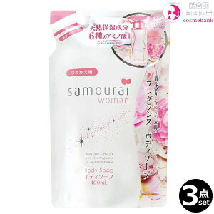 商品情報サムライ サムライウーマン ボディソープつめかえ用(400ml)つめかえ用。なめらかな泡が優しくボディを包み込み、汚れを落とすと同時に、保湿成分が肌に潤いを与えます。※パッケージ・内容等予告なく変更する場合がございます