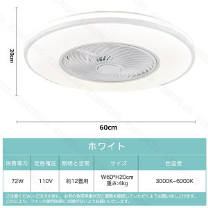 商品特徴: 【商品仕様】 電圧:100V−110V 定格電力:60w(LED:72w) 色温度:3000K/4000K/6500K(無階段調節) 調色機能:昼光色/昼白色/電球色 スイッチ:APP制御/専用リモコン/壁スイッチ 風速調...