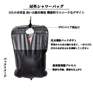 屋外用シャワーバッグ。キャンプ 登山 ドライブ!大口径デザイン、高速注水、ノブデザイン。回転式、水の大きさを自由にコントロール。シャンプーやボディーソープ等の小物を収納可能。温かい水または適量の水を入れ...