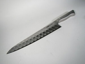 【総評】刃渡り20cmもある牛刀です。まあ、シェフナイフといってますのでね。やっぱりシェフが使うんですね。微妙なハンドル形状はやっぱりプロ仕様ですね。って、刃の構造からしてやっぱりプロ向け。でも家庭で使ってももちろんいいわけですよ。この切れ味を味わったらね、最高の包丁だと感じますから。●素材:ブレードは、最高の硬度を誇るMC66スチールを使用している。高級刃物鋼で挟み合金化した3層プレートを採用。