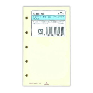 クリーム色の紙にローズゴールドの縁取りを施した華やかなリフィル。無地なので文字やイラストも描きやすく、手帳の中でもひときわ目立つ存在感を放ちます。サイズ(mm):縦105×横63