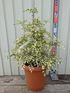 サイズ:6号スリット鉢 高さ:鉢下から約80cm お届け時期:随時お届け ※樹形・葉色ともに見事な商品です [斑入り シマトネリコ] 別名タイワンシオジとも呼ばれるモクセイ科トネリコ属の常緑高木。 本来は鮮やかな緑の照り葉ですが、アイ