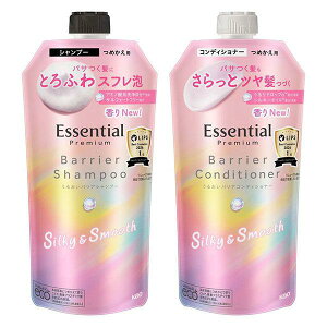 ▼5000円以上送料無料 (但し沖縄県、離島などは別途送料負担があります) 花王 エッセンシャル プレミアム ウルオイバリアコンディショナーシルキー&スムースつめかえ340mlはパサつく髪に。傷んだ髪を集中補修&コート...