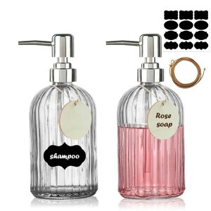 【商品仕様】:素材:ガラス+ステンレス、サイズ:500ml/本、セット内容:ソープディスペンサー2本+手押しポンプ2個+麻ひも2m+木片丸型ラベル2枚+シールラベル12枚 【おしゃれで高級感がある】:高品質のガラスで作られたこのソープ...