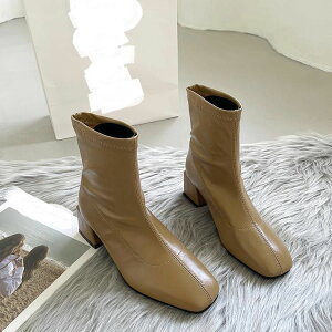 トレンドのスクエアトゥブーツ!5cmローヒールのショートブーツ。低ヒールだけど美脚も叶える優秀ブーツです。流行のチャンキーヒールでプラス5センチの足長スタイルをお楽しみください!太ヒールだから、かかとに体重が乗りやすく...
