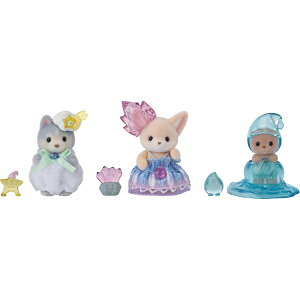 妖精の森のふしぎなおともだちと、魔法にかけられて変身した赤ちゃん3にんのセットです。フェネックの赤ちゃんは宝石、ハスキーの赤ちゃんは流れ星、ラッコの小さい赤ちゃんはしずくの姿をしています。おともだちは...