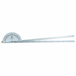 目盛はエッチングで刻み黒クロムメッキを施してあるので取れません。シルバー加工で表面の反射を抑え目盛が読み取りやすくなっています。2本竿タイプなので、鋭角な角度まで測れます。分度板の裏面三角関数表付。材質:ステンレス