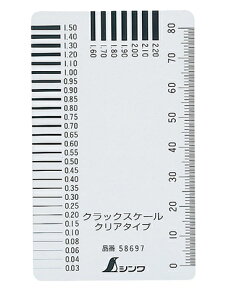 特長 ●透明でクラックに合わせやすくなっています。 ●壁や基礎など、コンクリートのひび割れの検査に使用できます。( 品確法により、住宅の検査が重要になってきています。) 仕様 ●本体サイズ 55×91×0.2mm ●目盛線巾精度 ±0...