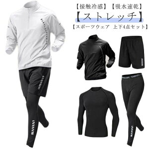 【スポーツウェア 上下4点セット】【接触冷感】【吸水速乾】【ストレッチ】【便利なフルセット】 長袖tシャツ・ジャケット・スパッツ・ショートパンツコスパ 抜群な4点セットです。【接触冷感機能搭載】ひんやり感が気持ちいい接触冷感