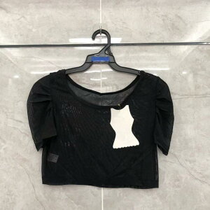 半袖 シースルー トップス ショート丈 スリムフィット 丸首 パフスリーブ チュール ブラック きれいめ 通勤・素材: 錦綸.??・柄: 無地・スタイル: プルオーバー・袖丈: 半袖・シルエット: タイト...