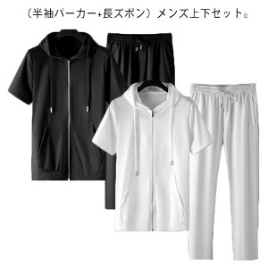 (半袖パーカー+長ズボン)メンズ上下セット。 ジップアップ仕様で着脱にやすいです。 ウエストは総ゴム、外側には調節可能なヒモ付きになっています。 上下別々にも使うことができシンプルなデガインで幅広いコーディネートか可能です