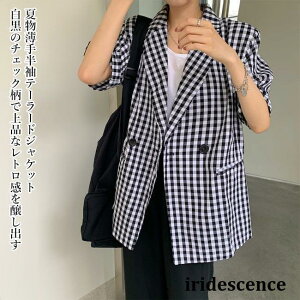 サマージャケット テーラード レディース シャツ テーラードジャケット 半袖 ブレザー 薄手 チェック柄 カジュアルスーツ 夏 半袖シャツレディース用のテーラードジャケット肌に優しい薄手生地に半袖仕様...