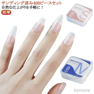 サンディング済み 400ピースセット。自然な仕上がりを手軽に!サンプル作成やネイルチップの練習にも最適。スタンダードな形状で、綺麗で理想的なネイルチップを作成可能。サンディング加工済みで、面倒な手間を省いてジェルを塗っても
