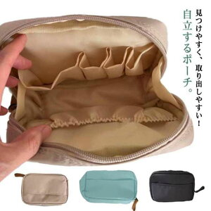 見つけやすく、取り出しやすい!自立するポーチ。立てたまま使えて、何が入っているか一目で分かる、ストレスフリーなメイクポーチ。しっかり自立し、取り出しやすい。ブラシやペンサイズのコスメも収納可能。使い終わったらスポンと