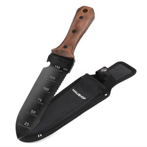 特徴:穴掘り、植え替え、根切り、除草など一本で多用途に使用できる 全長:約310mm 柄長:約130mm、刃長:約180mm、刃幅:約50mm 仕様:ギザ刃・メモリ付き ヘッド部:刃物鋼、ハンドル部:木