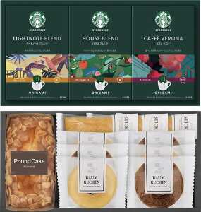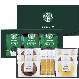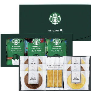 【商品名】 スターバックスコーヒー&スイーツギフト 【内容】バウムクーヘン ココア・バニラ ・スティックパイ プレーン ×各3、スターバックスオリガミドリップコーヒー ハウスブレンド・カフェべロナ・ライトノートブレンド 各9g×4p...