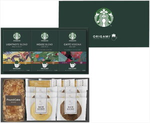 ■商品セット内容:スターバックスオリガミドリップコーヒー(ハウスブレンド9g×4・カフェベロナ9g×4・ライトノートブレンド9g×4)、バウムクーヘン(ココア・バニラ)×各3、スティックパイ(プレーン)×3、アーモンドパウンドケーキ ...