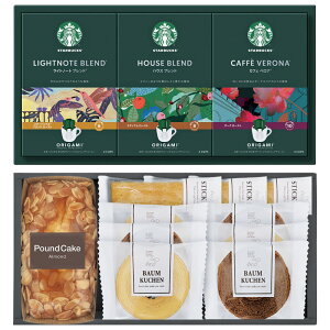 【爆買】 【説明文】 スターバックスコーヒーギフトとお菓子のセットでワンランクアップのひとときを。 【内容】 スターバックスオリガミドリップコーヒー(ハウスブレンド)×3、スターバックスオリガミドリップコーヒー(カフェベロナ)×2