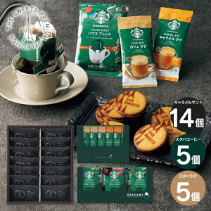 ■贅沢なスタバのドリップコーヒーとキャラメルサンドクッキーのギフトセット。ほろ苦いキャラメルサンドクッキーの風味が、スターバックスのコーヒーの奥ゆかしい味わいにマッチします。 ●キャラメルサンド×14、スターバックスオリ